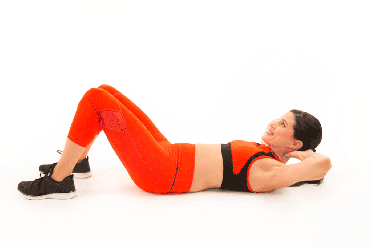 Acuéstate sobre la espalda, dobla las piernas, apoyando los pies en el piso. Coloca las manos detrás de la cabeza. Respira y eleva tu cuerpo superior del piso, mientras contraes el abdomen. Cuando exhales, regresa a la posición.