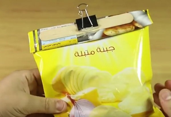 - Para asegurar el paquete abierto de especias, cacao y otros productos, puedes utilizar una presilla para papeles y dos listoncitos de madera, como el que aparece en la imagen.