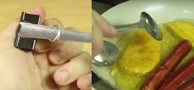 - La misma presilla puedes utilizarla como fórceps: Es muy conveniente para mezclar ensaladas de verduras, voltear panqueques o salchichas fritas. Simplemente inserta los mangos de las cucharas, a través de la presilla, tal como se muestra en la foto.