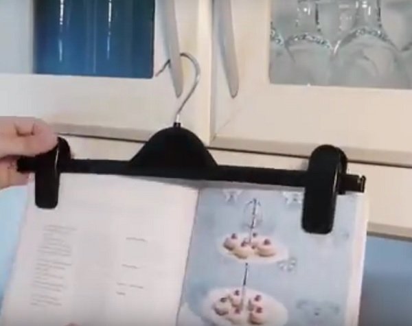 - El libro o cuaderno de recetas favoritas, ábrelo en la página deseada, y cuélgalo en el mango del armario de la cocina, haciendo uso de una percha para los pantalones. ¡La receta – ante tus ojos, y las hojas del cuaderno – limpias y bellas!