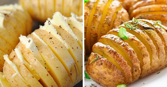 - Las patatas fritas son preferidas en muchas familias. Si tu familia — no es la excepción, prueba ahorrar tiempo y aceite vegetal, preparando las papas al horno. Lava los tubérculos, has las incisiones, salpícalos con un poco de aceite, sálalos y añádeles las especias. ¡40 minutos al horno a 220 grados — y ya están listos! En los cortes, puedes poner cualquier relleno: trocitos del gordo del puerco, mantequilla o rodajas del queso fundido.