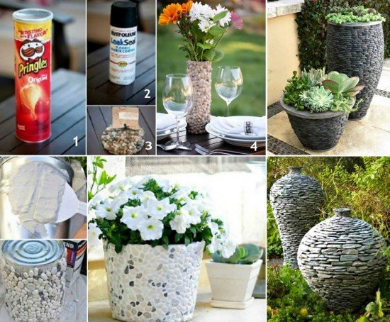 - ¡Qué macetas para plantas más originales pueden salir, si encendemos la imaginación! Piedras y conchas marinas pegadas a la caja de papas fritas vacía. ¿Y por qué no?