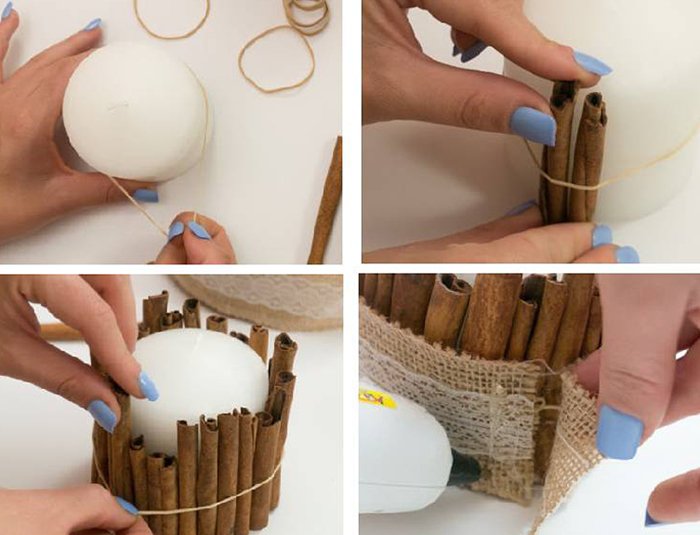 Una excelente solución para el aroma natural son los palitos de canela. Para hacer esto, pon una banda elástica sobre la vela e inserta los palos de la especia debajo. Arregla la decoración verticalmente con respecto a la vela. ¡Luego, pega la cinta y disfruta de la fragancia y la luz suave!