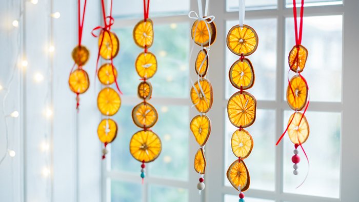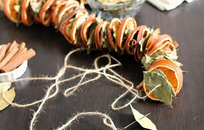 Inserta las rodajas en una cinta. Puedes agregar una hoja de laurel o palitos de canela entre los lóbulos para obtener un sabor más intenso. Una guirnalda original para la ventana o para el árbol de navidad.