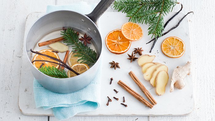Un par de horas antes de la llegada de los invitados, prende fuego a una olla pequeña de agua con rodajas de naranja, vainilla, jengibre, ramitas de abeto y clavos de olor. Tan pronto como la mezcla hierva, reduce el calor y deja evaporar el agua.