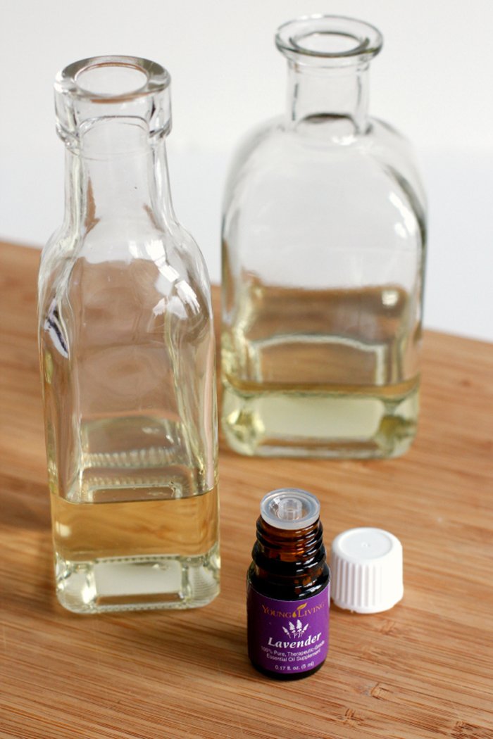 Pon todo en un frasco grande, y agrega unas gotas de aceites aromáticos, como el aceite de naranja, canela o de pino.