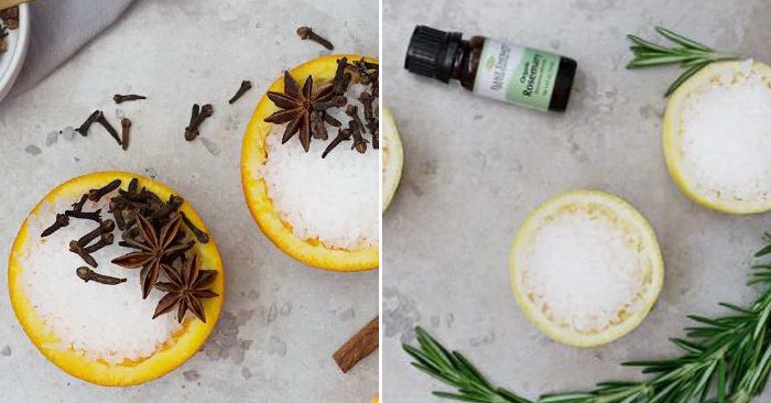 También puede usar cáscara de limón, llenándola con una mezcla de sal, aceite esencial de romero y extracto de vainilla.