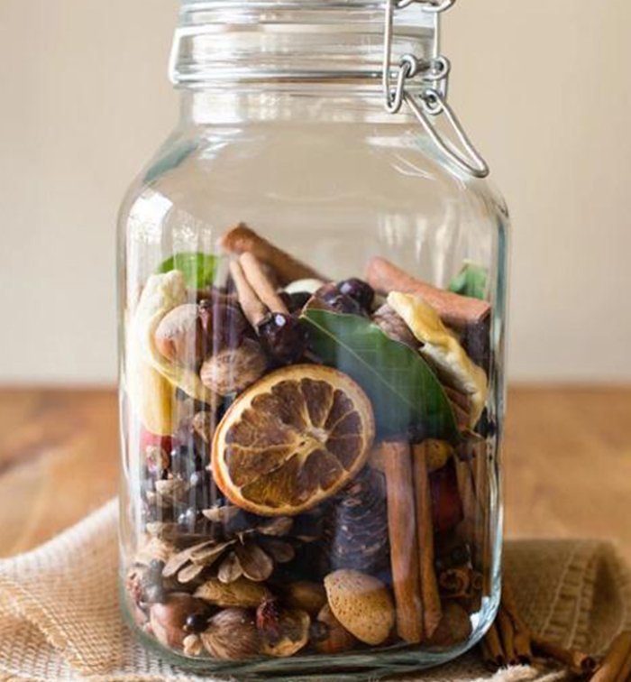 Y aquí hay otra manera simple pero interesante. Para ello, necesitas una mezcla de frutas secas, especias y decoración navideña, además de fragancias artificiales.