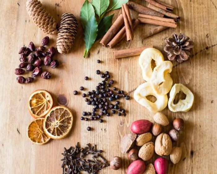 Prepara cualquier decoración seca para las fiestas de Año Nuevo. Estos pueden ser rodajas de cítricos, manzanas, rosas, conos, nueces enteras, hojas, ramas de canela y otras especias.
