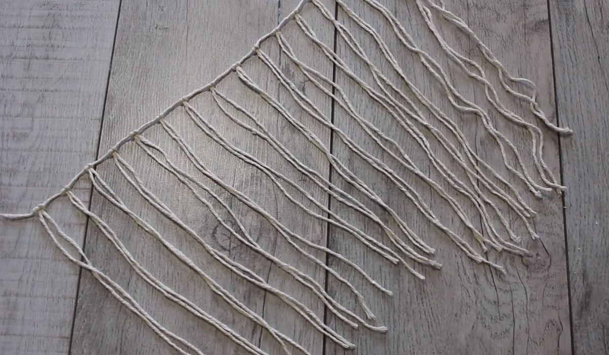 - Coge una cuerda fina, córtala y colócala como se ve en la foto. Ata los nudos, manteniendo un espacio igual.