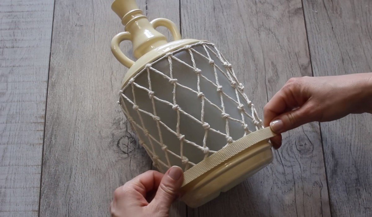 - Pega la cuerda larga (donde se une todo) a la parte superior de la botella. Teje las cuerdas cortas de forma escalonada para hacer una especie de red de pesca.