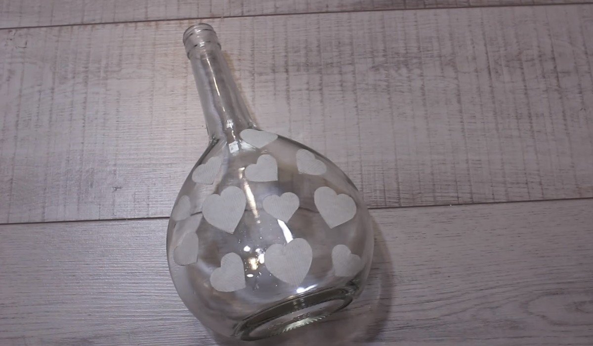 - Retira las etiquetas de la botella y desengrasa la superficie. A continuación, utiliza cinta adhesiva para dibujar los corazones, recórtalos y pégalos en la botella.