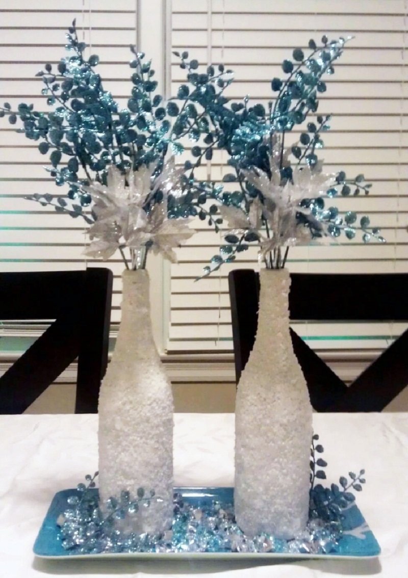 De esta misma forma, puedes decorar cualquier recipiente de vidrio. Puedes hacer lindos candelabros cubiertos de sal que simulan la nieve o simplemente enrollar juguetes de árboles de Navidad. Si deseas combinar varios colores en la composición, usa sal marina multicolor.