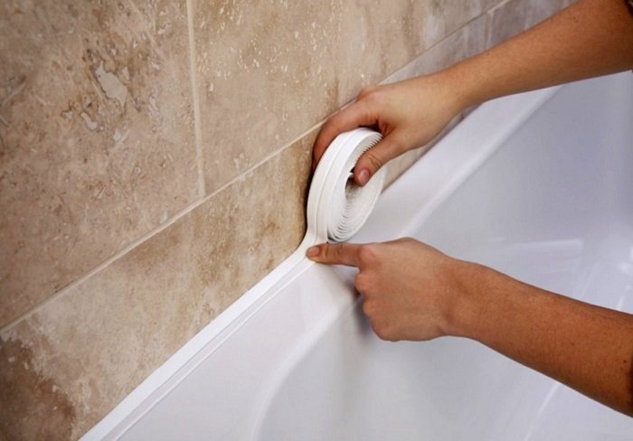 Esta es forma más rápida y asequible para aquellos que están pensando en hacer frente a las pequeñas lagunas. La composición de estas cintas incluye fungicidas, de modo que el problema del moho se resolverá por sí mismo. Cuando se seque el pegamento de la cinta, limpia la superficie eliminando la tira protectora en el lado inferior.Sin embargo, muchos profesionales no confían en el pegamento aplicando por el fabricante, por lo que aconsejan utilizar clavos líquidos.