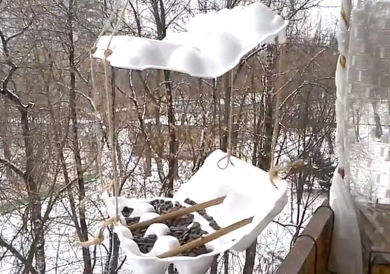 ¿Por qué no hacer una buena acción, y construir un comedero para pájaros con una bandeja de huevos? Lo mejor es que la comida no se caerá de aquí, a la vez que quedará dividida en porciones para que todas las aves. Y el cartón en sí es inofensivo para las mismas.