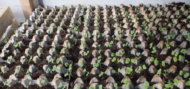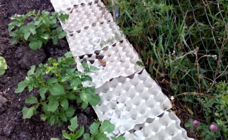 Si hay suficientes bandejas grandes (para 30 huevos), entonces también pueden colocar carriles entre las camas. Durante la temporada de siembra, las cajas de cartón serán suficientes, y posteriormente pueden enterrarse en el suelo: el papel se descompondrá suavemente en sustancias seguras.