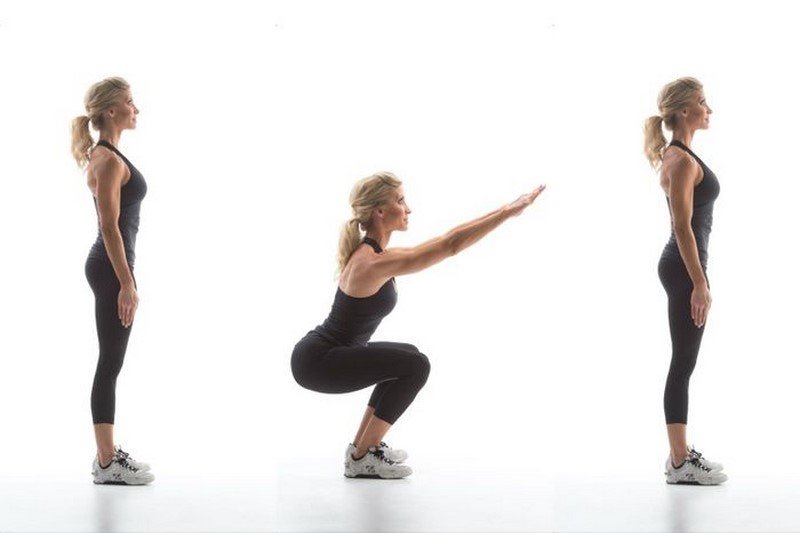 Es importante aprender a hacer sentadillas correctamente. Por lo tanto, párate derecho, con los pies separados al ancho de los hombros. La parte posterior debe estar nivelada, para no sobrecargar la parte inferior de la espalda. Ligeramente lleva tus caderas hacia atrás y comienza a ponerte en cuclillas.