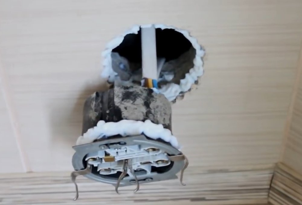 - Inmediatamente después de aplicar el adhesivo, inserta con cuidado el enchufe en la caja de la pared y presiona firmemente. Después de eso, aprieta completamente los tornillos de ajuste y retira el exceso de pegamento de la pared con una toalla de papel.