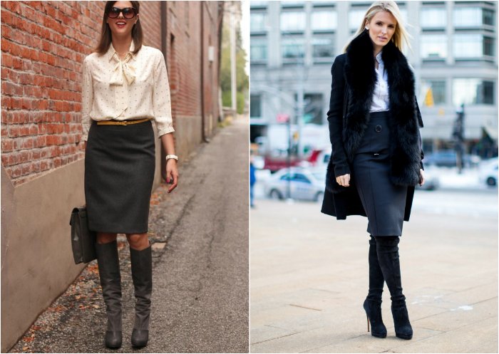 1. La falda-lápiz hasta la rodilla y las botas hasta la rodilla. Tal combinación incluso a una chica flaca con pies largos le añadirá el ímpetu y el empuje, sin hablar ya de una señorita con formas más pomposas. Por eso, si aspiras a crear una imagen frágil y elegante, no elijas esta combinación.