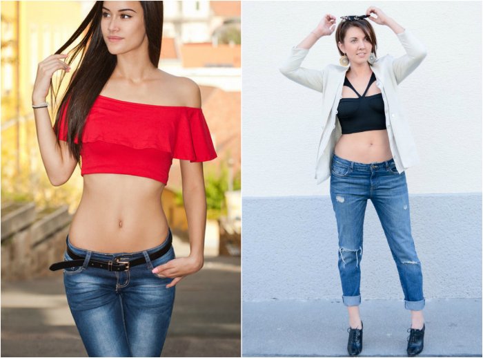 8. Los vaqueros a la cadera y un top reducido. Tal imagen estaba a la moda en 2000, pero también hoy se encuentra a menudo en la calle. Si quieres demostrar los resultados de tu trabajo en el gimnasio, pon el top con los vaqueros a la cintura: se verá mucho más fino.