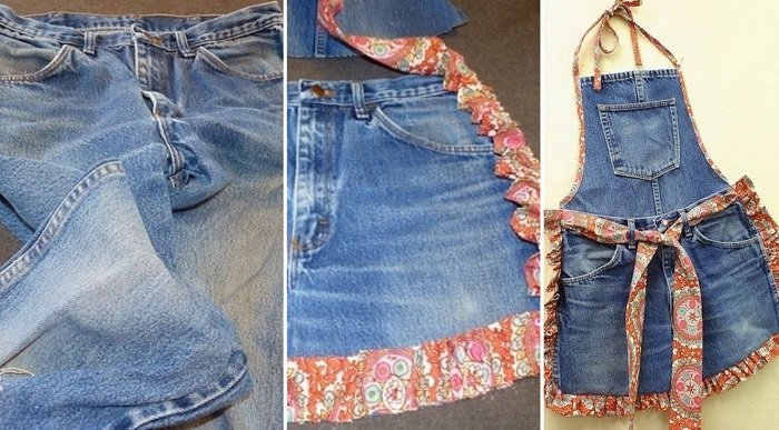Este delantal para la cocina se puede hacer en unas pocas horas, y ¡podrá ser testigo de las delicias de la anfitriona durante muchos años! La idea de confeccionarlo a partir de un par de viejos jeans me resultó especialmente inspiradora…