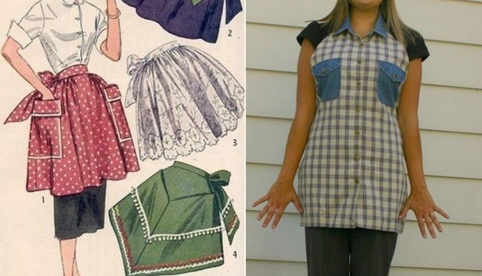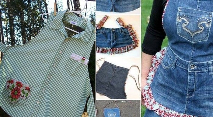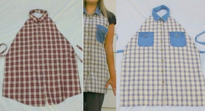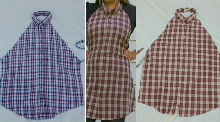 - Los delantales particularmente cómodos y lindos para la cocina se pueden confeccionar a partir de camisas de hombres que ya han cumplido su tiempo de vida.