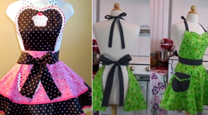 - Las mujeres tienden a pasar mucho tiempo todos los días en la cocina, pero incluso allí quieren verse atractivas. Un delantal elegante y hermoso puede convertir a un ama de casa cansada en una mujer radiante e incansable, porque para que las tareas domésticas sean fáciles y sencillas, no hay nada como sentirse bien cómoda con una misma.