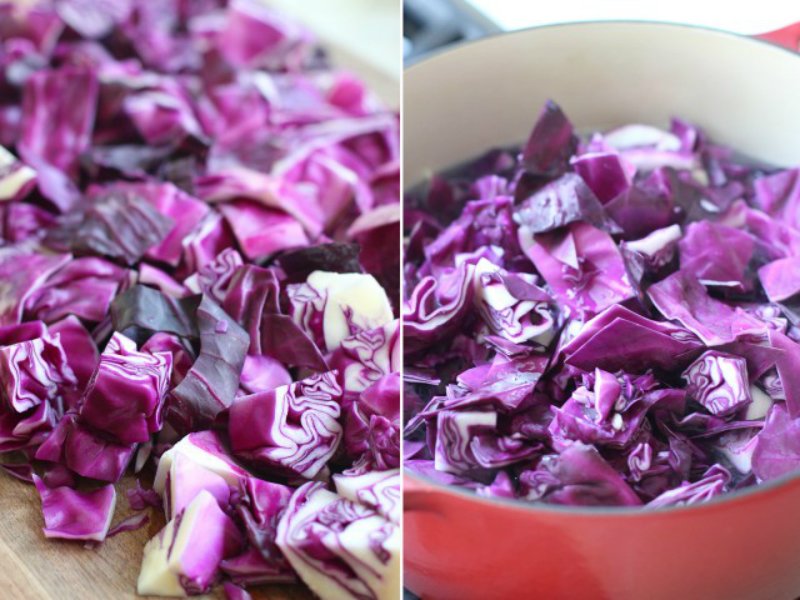 La preparación del colorante no tiene muchas complicaciones: corta la col en pequeñas porciones, pon todo en una olla y vierte 0,5 litros de agua. Lleva a punto de ebullición y cocina a fuego lento durante 40-45 minutos. Retira la olla del fuego, deja que el líquido se enfríe por completo. Ya puedes sacar el repollo fuera del agua. Vierte en el caldo resultante 4-5 cucharadas de vinagre.