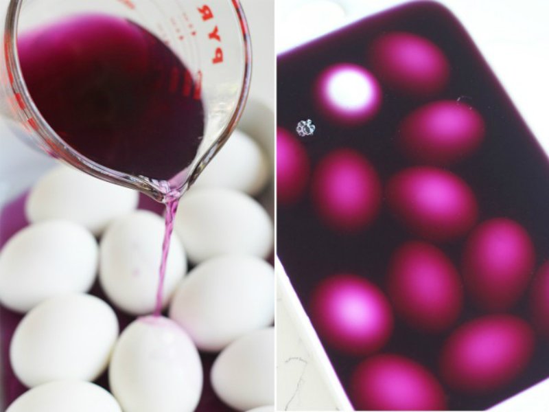 Los huevos duros (de cáscara blanca) sumérgelos en el caldo de repollo por 3-4 horas. Qué color más exquisito, ¿no es así? Recuerda, cuanto más tiempo estén los huevos en el caldo, más intenso será el tono resultante.