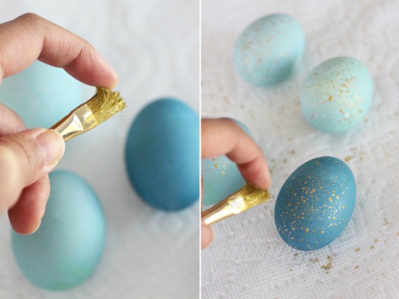 Y ahora viene un pequeño truco: con un cepillo de cerdas duras o un cepillo de dientes viejo, espolvorea los huevos con un colorante alimentario de color dorado. ¡No olvides de cubrir la mesa con servilletas!
