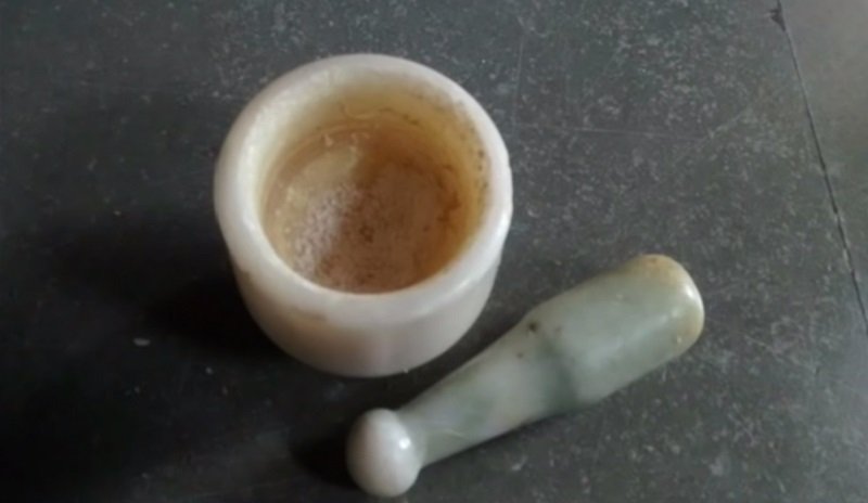 Si mueles unos granos de arroz en el mortero, estos se convertirán en una harina blanca. El arroz artificial molido tendrá un tono amarillento.