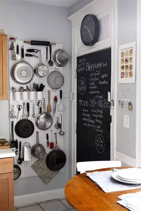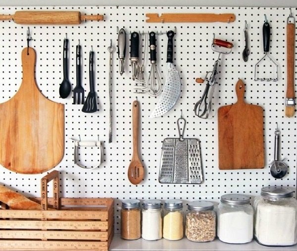 Por lo general, las amas de casa intentan colocar todos los electrodomésticos de cocina en los estantes, pero esto no es muy razonable, ya que es casi imposible encontrar algo en estas cajas. Para tener todo en un lugar visible y al alcance de tu mano, puedes instalar un panel perforado en la cocina y montar ganchos en él. Definitivamente no perderás de vista nada, y todo estará a tu alcance.