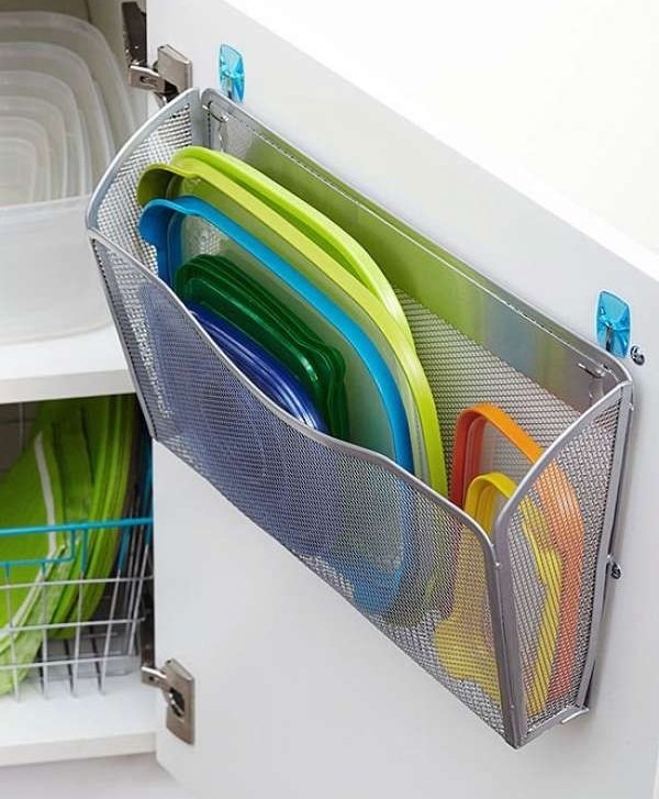 Para garantizar que las bandejas y los platos no ocupen mucho espacio, las colocamos una detrás de la otra y no queda espacio para las cubiertas. Puedes tomar una cesta colgante convencional para papeles, y colocar las cubiertas de recipientes de plástico u otros. Entonces nunca se perderán y estarán a tu alcance.