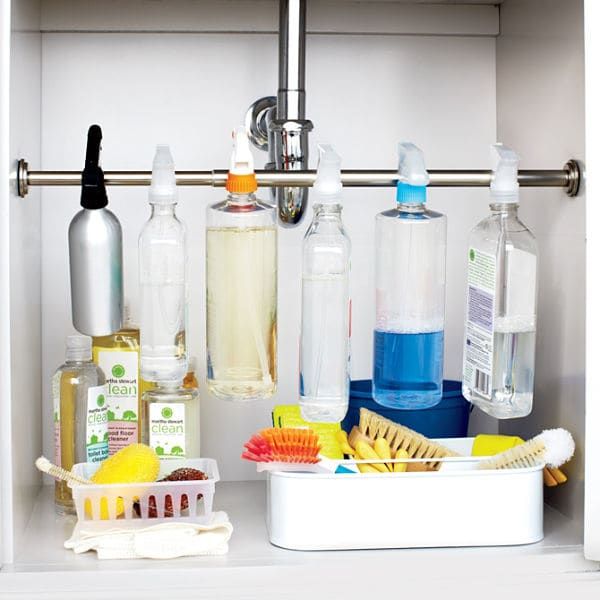 Si mantienes los productos químicos domésticos debajo del fregadero de la cocina, este truco definitivamente te gustará. Atornilla una sola barra, que sirva para colgar los recipientes con agentes de limpieza directamente por la pistola. Ni siquiera necesitas ganchos para colgarlos.