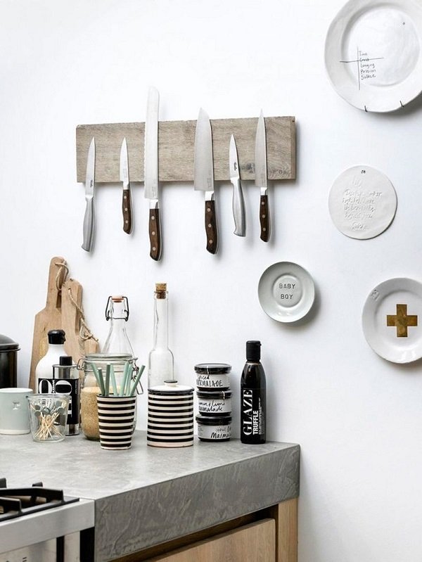 Los imanes no son solo para el refrigerador. Puedes atornillar una placa magnética en un lugar conveniente, a la cual le puedes adherir latas con cubiertas metálicas y cuchillos.