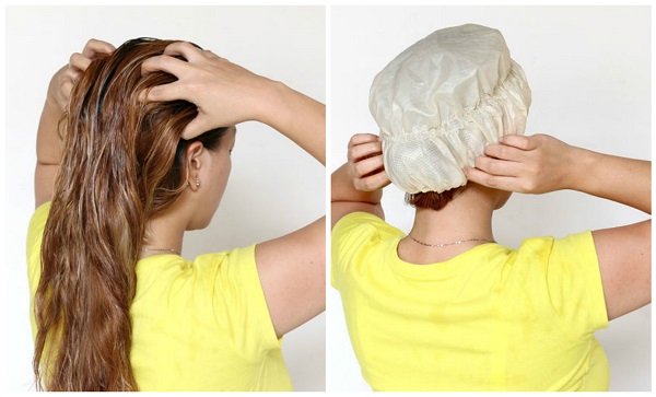 Aplica el remedio a las raíces del pelo, y frótalo en la piel de la cabeza 1 hora antes de lavar el pelo, 3 veces a la semana. Para lograr mejor resultado, ponte un gorro de ducha o una bolsa de plástico, y envuelve la cabeza con una toalla. Arropado, el pelo absorberá mejor las sustancias curativas de la mascarilla.
