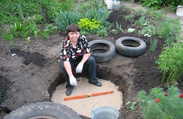 - En los pozos ya preparados, coloca los neumáticos. Para hacer que la superficie de la futura charca quede horizontal y pareja, puedes utilizar un nivel.