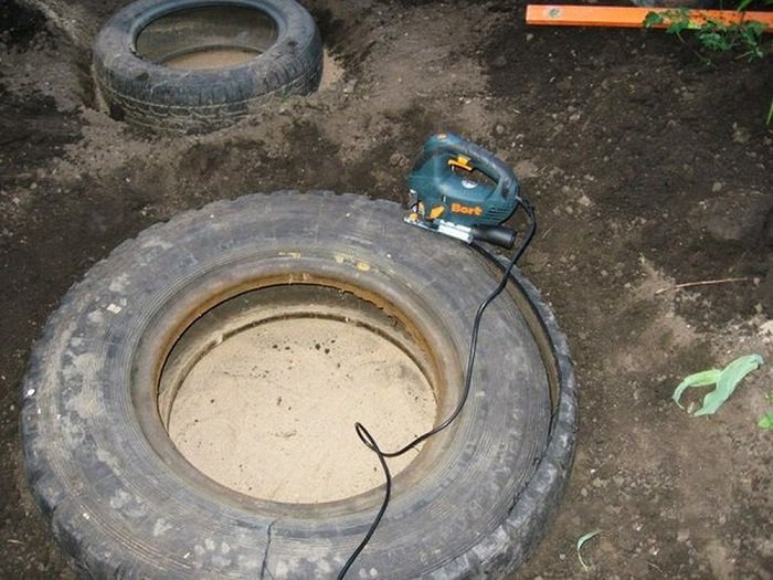 - La parte superior del neumático puedes cortarla con una sierra circular.