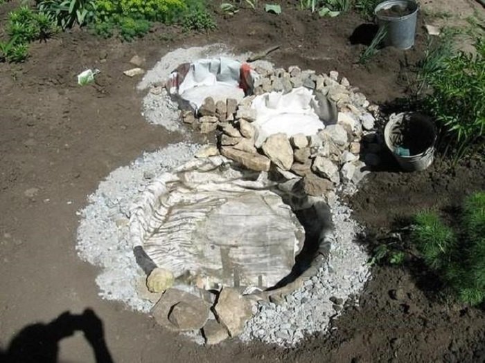 - Recubre la parte interior del futuro estanque con un forro impermeable. Para ello, puedes utilizar polietileno, pero te aconsejamos comprar un material impermeable especial. Los bordes del material, sácalos afuera y sujétalos con grandes piedras.