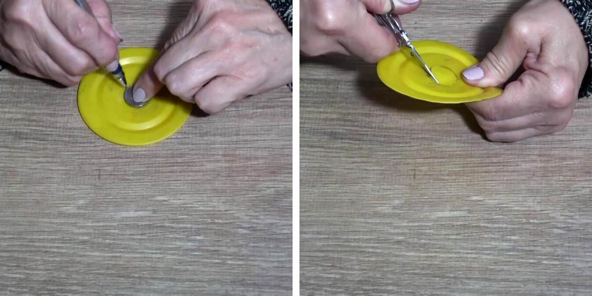 - Coloca una moneda en el centro de cada plato y traza alrededor con un bolígrafo. A continuación, recorta con cuidado a lo largo del contorno.