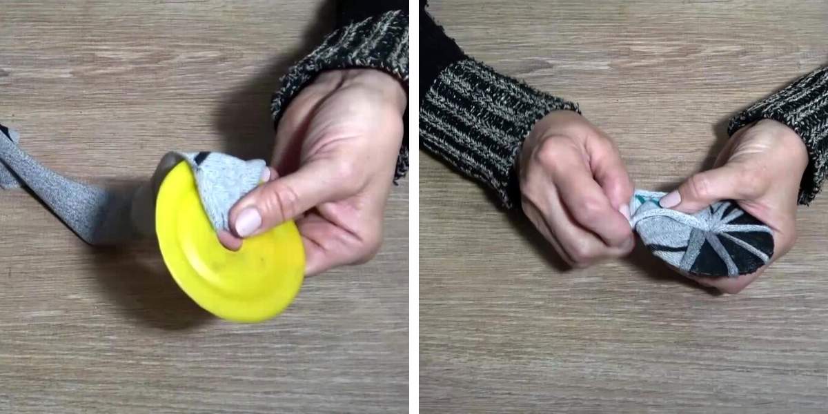 - Corta los trozos en tiras de 5 cm de grosor. Ahora tienes que envolverlos alrededor de las piezas de plástico, enhebrando la tela a través del agujero.
