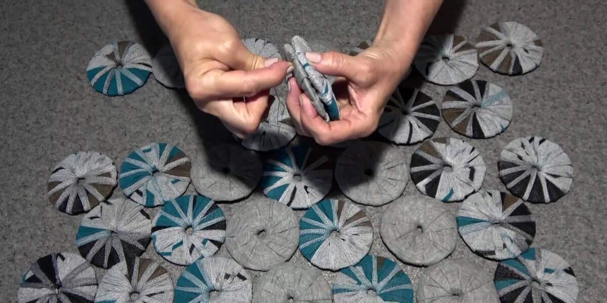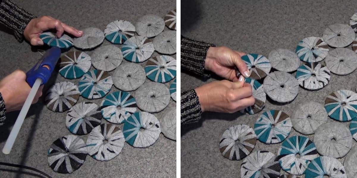 - Dobla las tiras para hacer un tapete. A continuación, pega y cose las tiras.