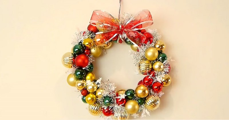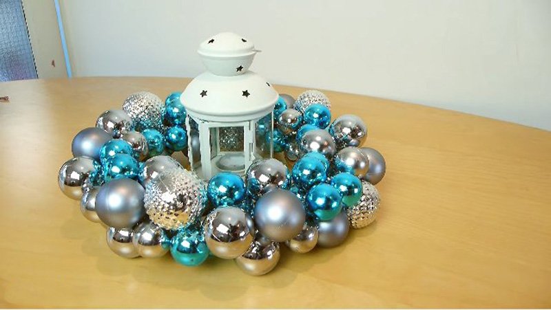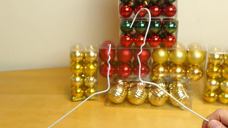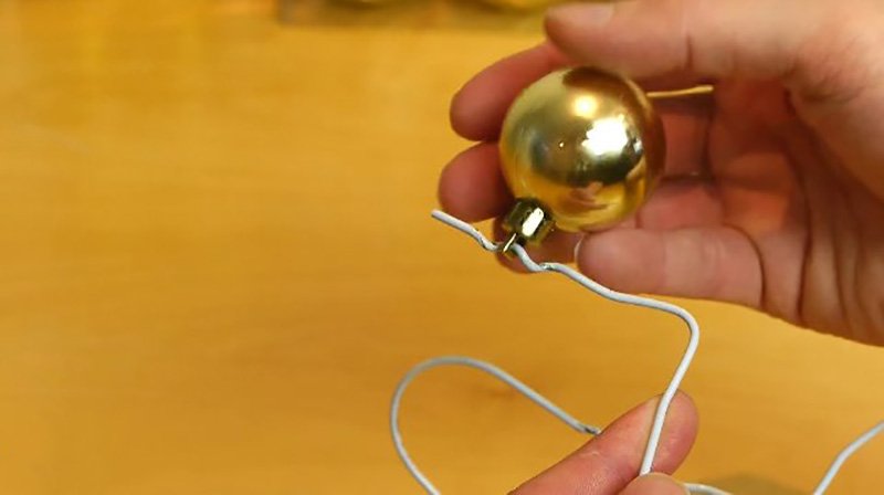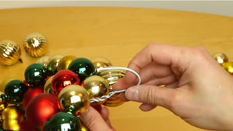 - Coloca las esferas navideñas en el alambre. Utiliza adornos de formas y colores diferentes — así la corona lucirá mucho más interesante y original. Si dispones de esferas de colores similares, puedes pintarlas con un tinte de aerosol.