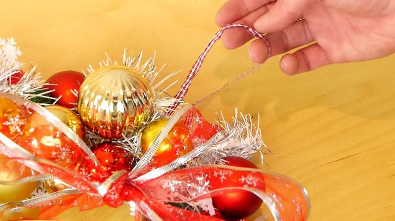 - Ahora, puedes empezar a decorar la corona. Puedes enrollarla con cintas y ramas de abeto.