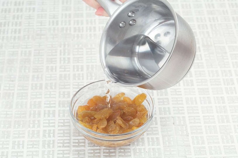 - Échales el agua tibia a las pasas y déjalas reposar durante 15 minutos, luego saca las bayas del agua y lávalas bien. Vuelve a echarles el agua fría hervida y déjalas para 24 horas.