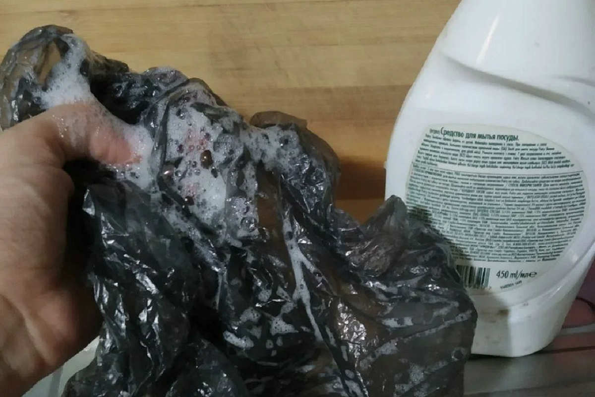 - Añade 2-3 cucharadas de detergente para platos y un poco de agua caliente en una bolsa grande.