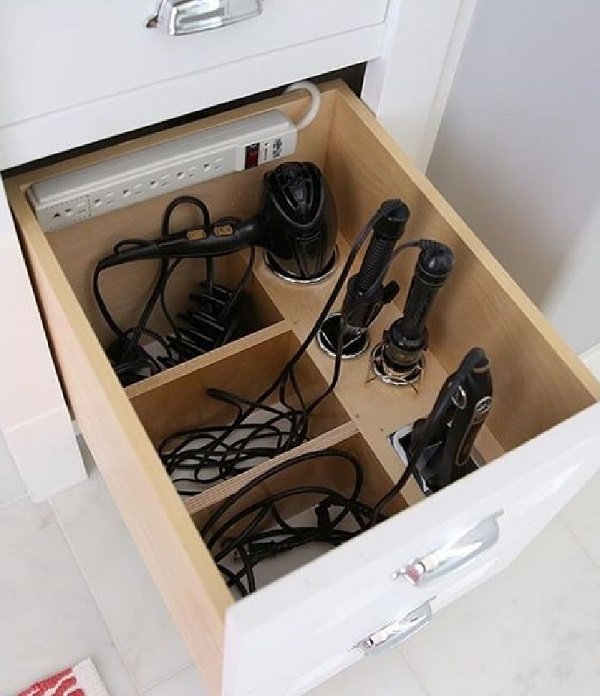 Y aquí hay otra idea útil para ayudarte a lidiar con el problema del almacenamiento de los accesorios. Se apiñan en ranuras que quedan libres entre otras cosas.