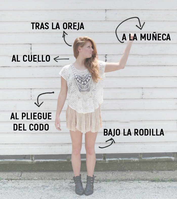 - El toque final antes de salir. Para que el aroma se mantenga durante más tiempo, aplica el perfume sobre los puntos «calientes».