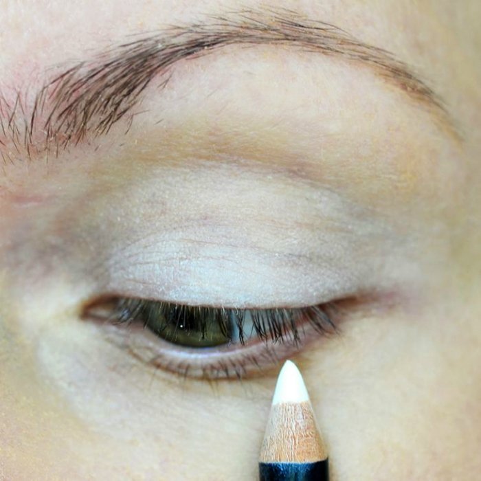 - Puedes sustituir la base para las sombras de ojos por el lápiz de color blanco mate. Aplícalo a todo el párpado.