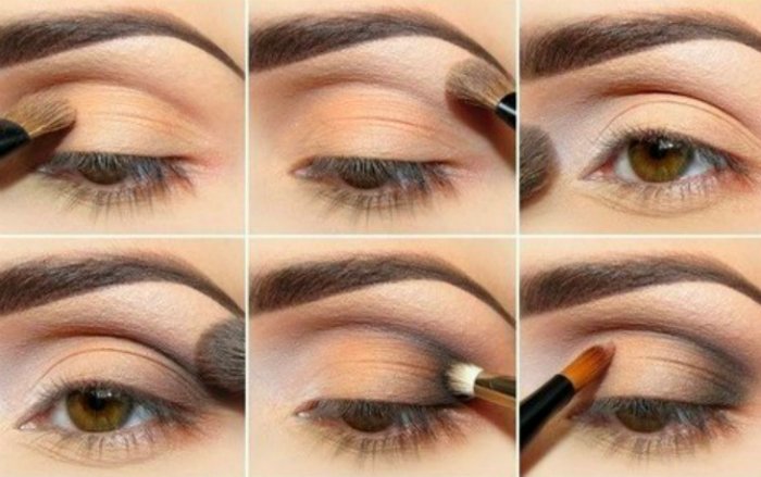 - Aplica la sombra de ojos gradualmente: el matiz base — a todo el párpado, el más claro — a la esquina interior del ojo y debajo de la ceja; con el matiz oscuro, alinea la esquina exterior del ojo.